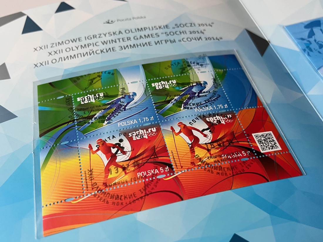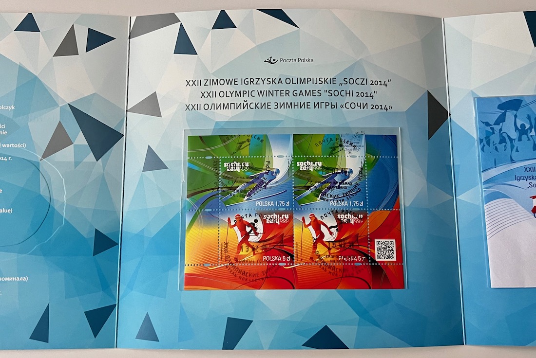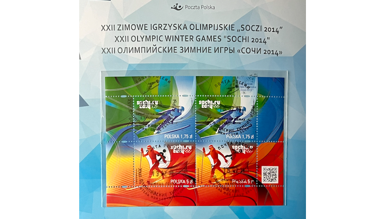 Folder filatelistyczny zawierający znaczki kolekcjonerskie z XXII Zimowych igrzysk olimpijskich w SOCZI 2014.